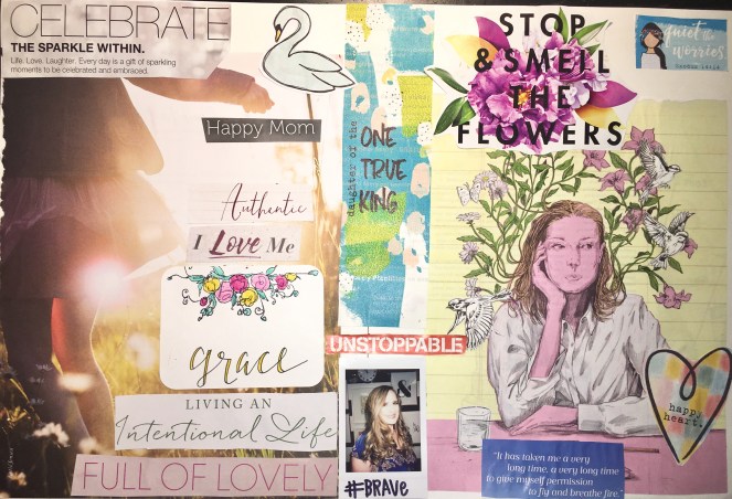 After lunch, a group therapy session and dinner, my group headed back to our cabin for a fun evening of creativity. Magazines, markers, paints, brushes and watercolor paper covered the table. We had several options for the night. We could choose art journaling or we could work on a vision board. Some chose to do both. I ended up super focused on creating a vision board for myself.